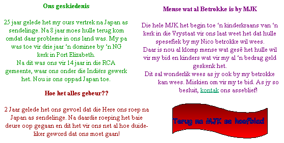 Jy het seker al van 'n sendeling gehoor. Miskien in jou kerk of op die radio. Dan dink jy seker dit is 'n ou man wat mal is en wat na 'n ander land toe gaan om Jesus se boodskap in mense se kele af te druk. Wel hier is dit anders! 'n Gesin van drie is op pad Japan toe om sendelinge te wees. Tobie (53), Annalie (46) en ek Nico (13) de Wet. Wat wonderlik is van hierdie sending, is dat klomp kinders deel van die sending is. Kinders het besluit om by my Nico betrokke te wees, m.a.w. om vir my te ondersteun met kontak en 'n klein bedrag geld. Ek Nico gaan nie sending doen om op my eie plannetjie mense te help nie en vir my self 'n goeie rekord op te bou nie, nee ek gaan om julle verteenwoordiger te wees om julle amdassedeur te wees om in julle plek te gaan as 'n sendeling!